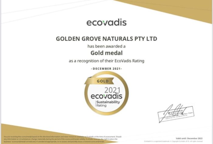 Golden Grove Naturals, an Australia Small to Medium Enterprise which grows, manufactures, exports and markets sustainably produced essential oils. Today announces receiving Ecovadis esteemed Gold Sustainability ranking. The Gold ranking places Golden Grove in the top 4% of over 75,000 business rated by Ecovadis globally. A tremendous achievement for a Small to Medium Farming enterprise which manufactures the natural aromatic chemicals onsite.